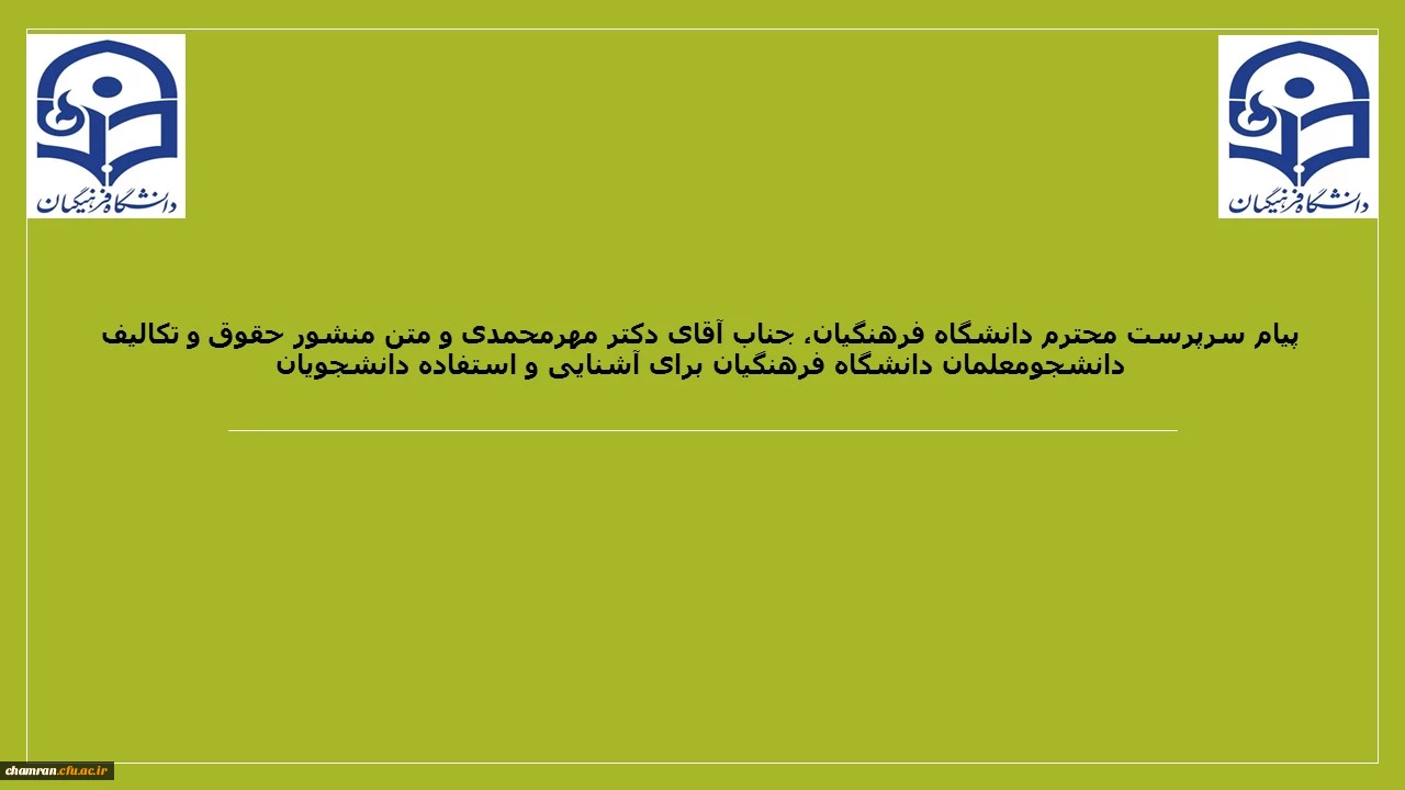 پیام سرپرست محترم دانشگاه فرهنگیان، جناب آقای دکتر مهرمحمدی و متن منشور حقوق و تکالیف دانشجومعلمان دانشگاه فرهنگیان برای آشنایی و استفاده دانشجویان 2