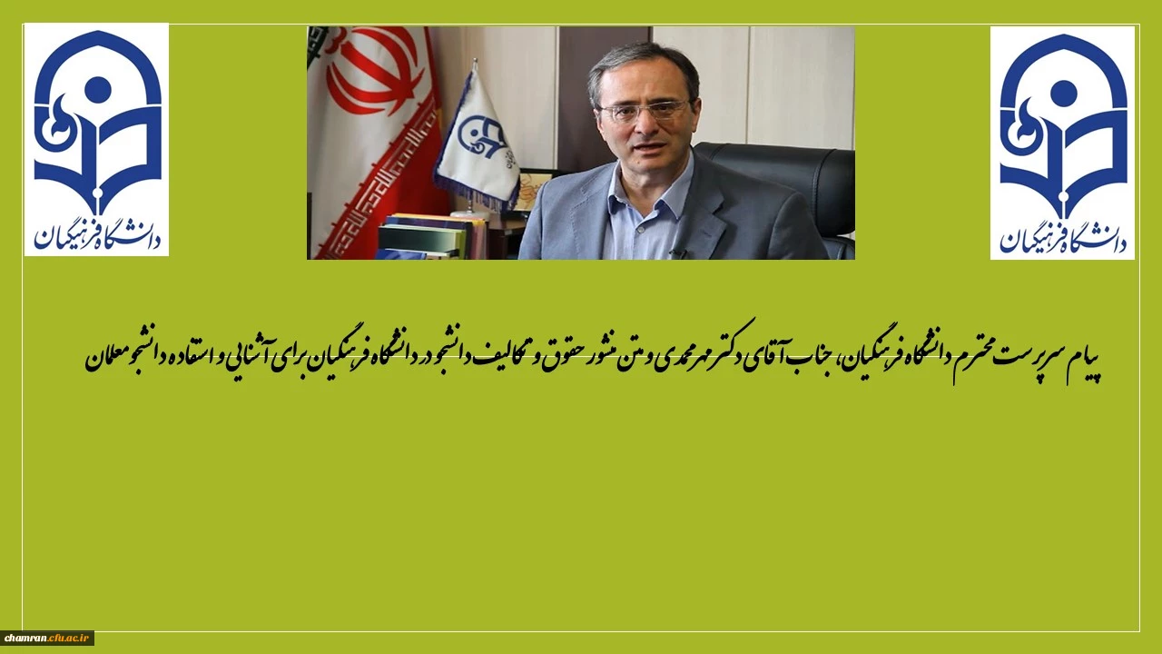 پیام سرپرست محترم دانشگاه فرهنگیان، جناب آقای دکتر مهرمحمدی و متن منشور حقوق و تکالیف دانشجودر دانشگاه فرهنگیان برای آشنایی و استفاده دانشجومعلمان 3