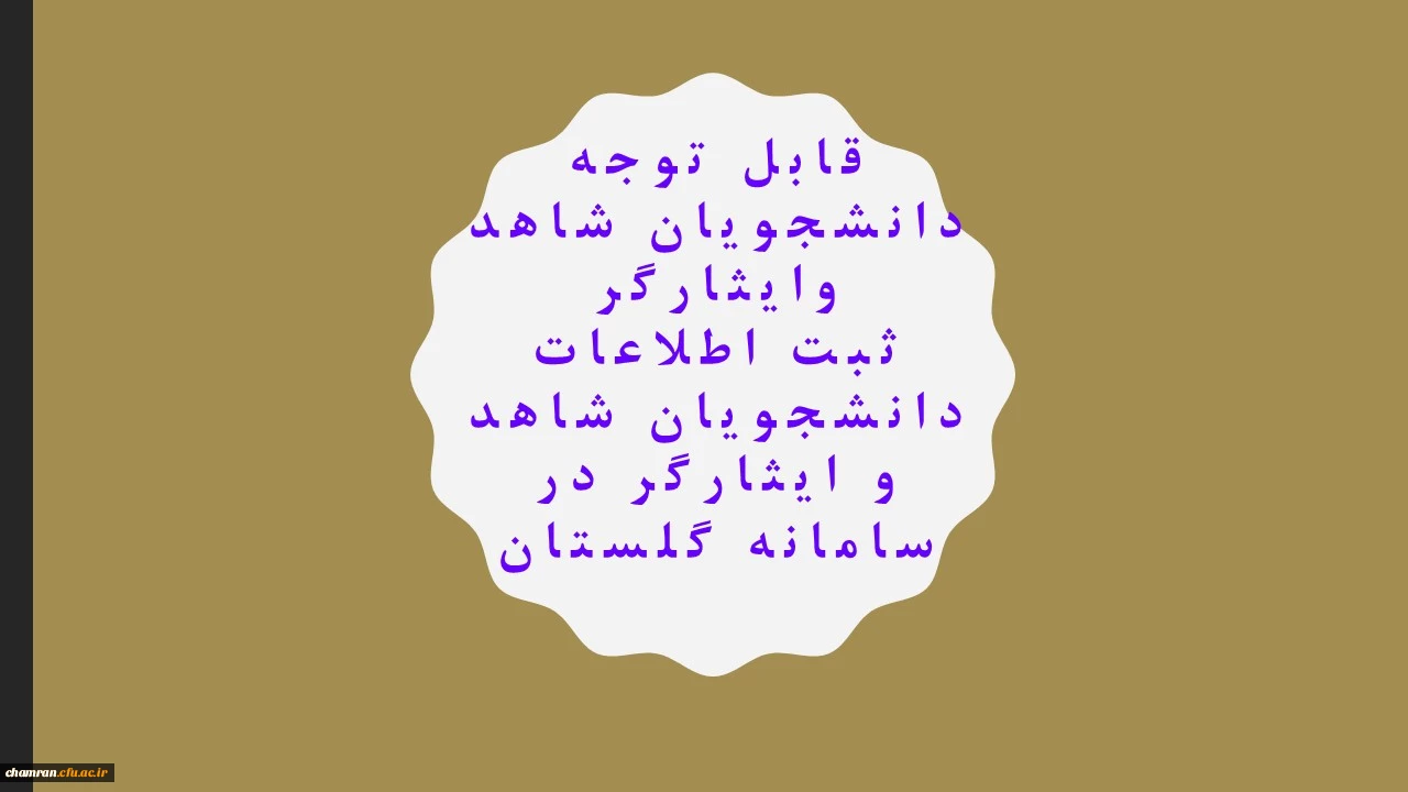 امتیاز دهید : ثبت اطلاعات دانشجویان شاهد و ایثارگر در سامانه گلستان 3 چهارشنبه 14 تیر 1396 ساعت 14:10