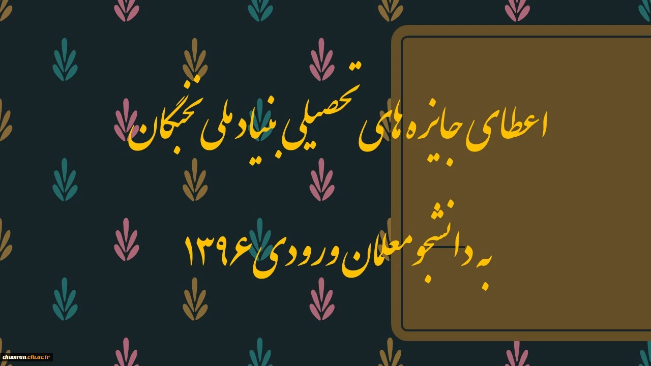 امتیاز دهید : اعطای جایزه های تحصیلی بنیاد ملی نخبگان به دانشجومعلمان ورودی ۱۳۹۶ 3 چهارشنبه 5 مهر 1396 ساعت 8:29