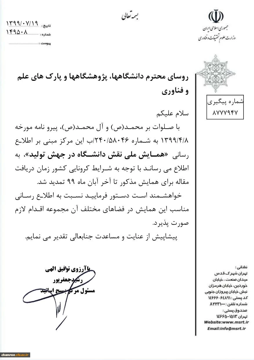 امتیاز دهید : تمدید مهلت دریافت مقاله برای همایش ملی نقش دانشگاه در جهش تولید 2 سهشنبه 6 آبان 1399 ساعت 8:38