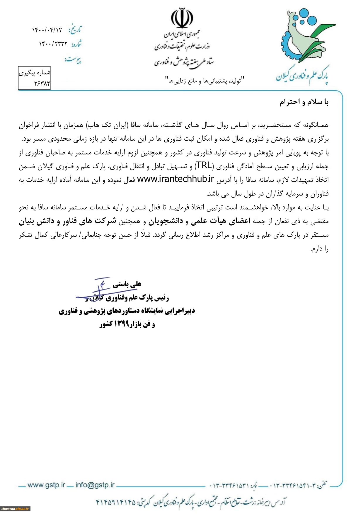 امتیاز دهید : فعالیت مستمر سامانه سافا به منظور ثبت فناوری، ارزیابی و تعیین سطح آمادگی فناوری 3 شنبه 16 مرداد 1400 ساعت 10:17