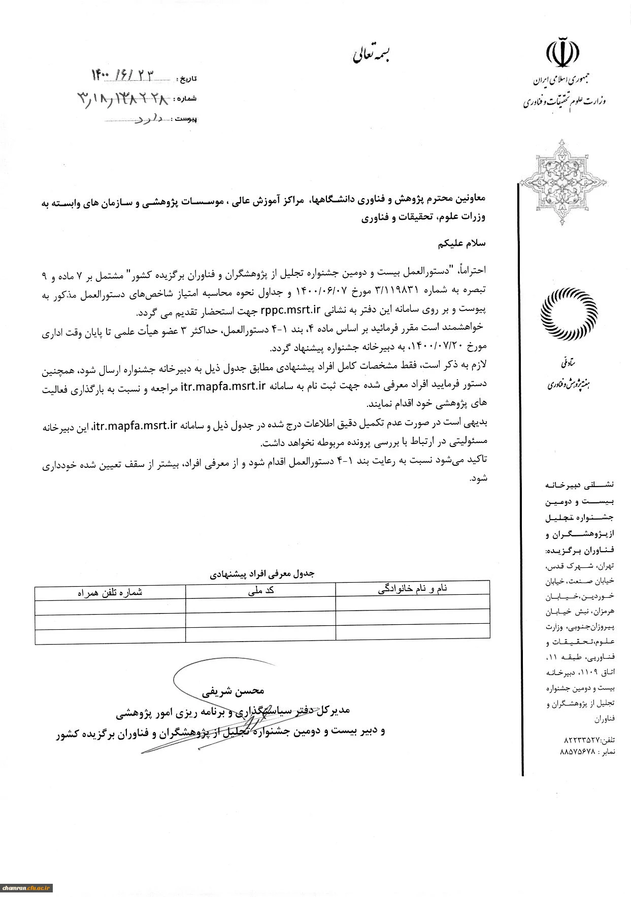 دستورالعمل بیست دومین جشنواره تجلیل از پژوهشگران و فناوران برگزیده کشور (وزارت علوم تحقیقات و فناوری) 2