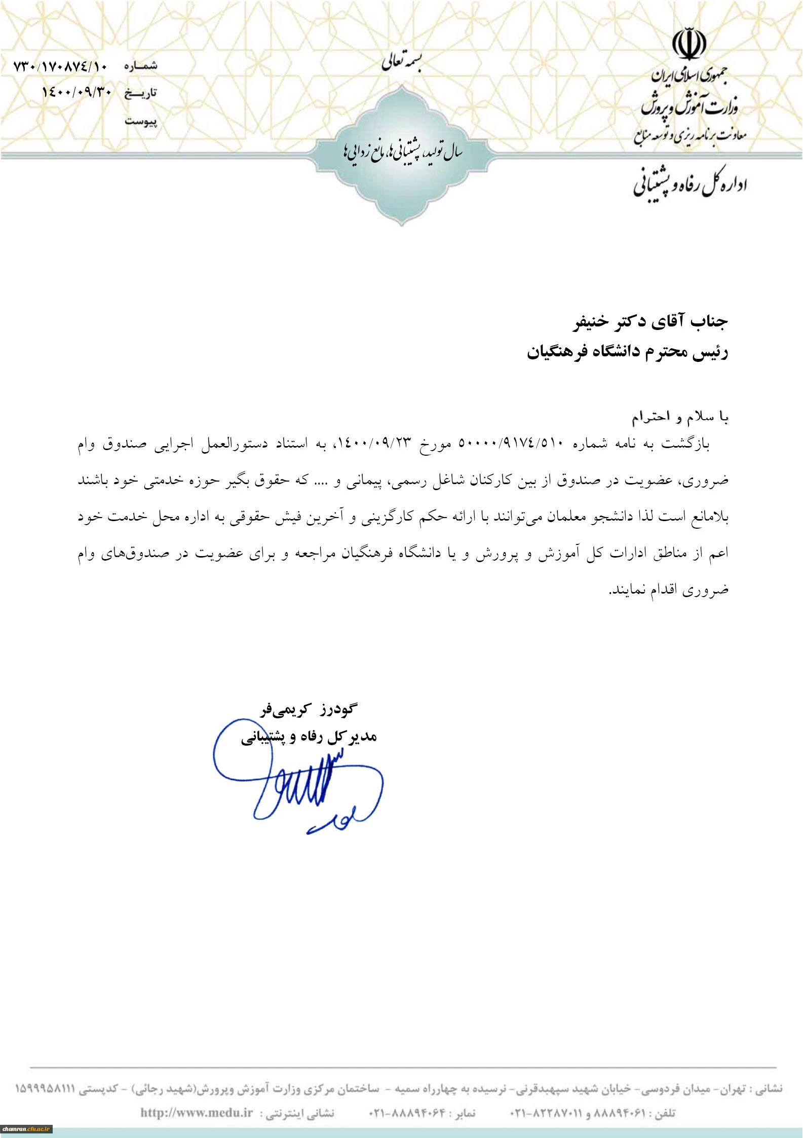 امتیاز دهید : مجوز عضویت دانشجویان در صندوق های وام ضروری آموزش و پرورش 2 سهشنبه 14 دی 1400 ساعت 8:36