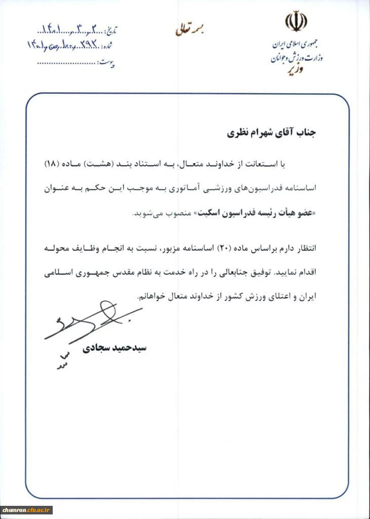 امتیاز دهید : انتصاب دکتر شهرام نظری به عنوان عضو هیئت رئیسه فدراسیون اسکیت 2 چهارشنبه 4 خرداد 1401 ساعت 11:46