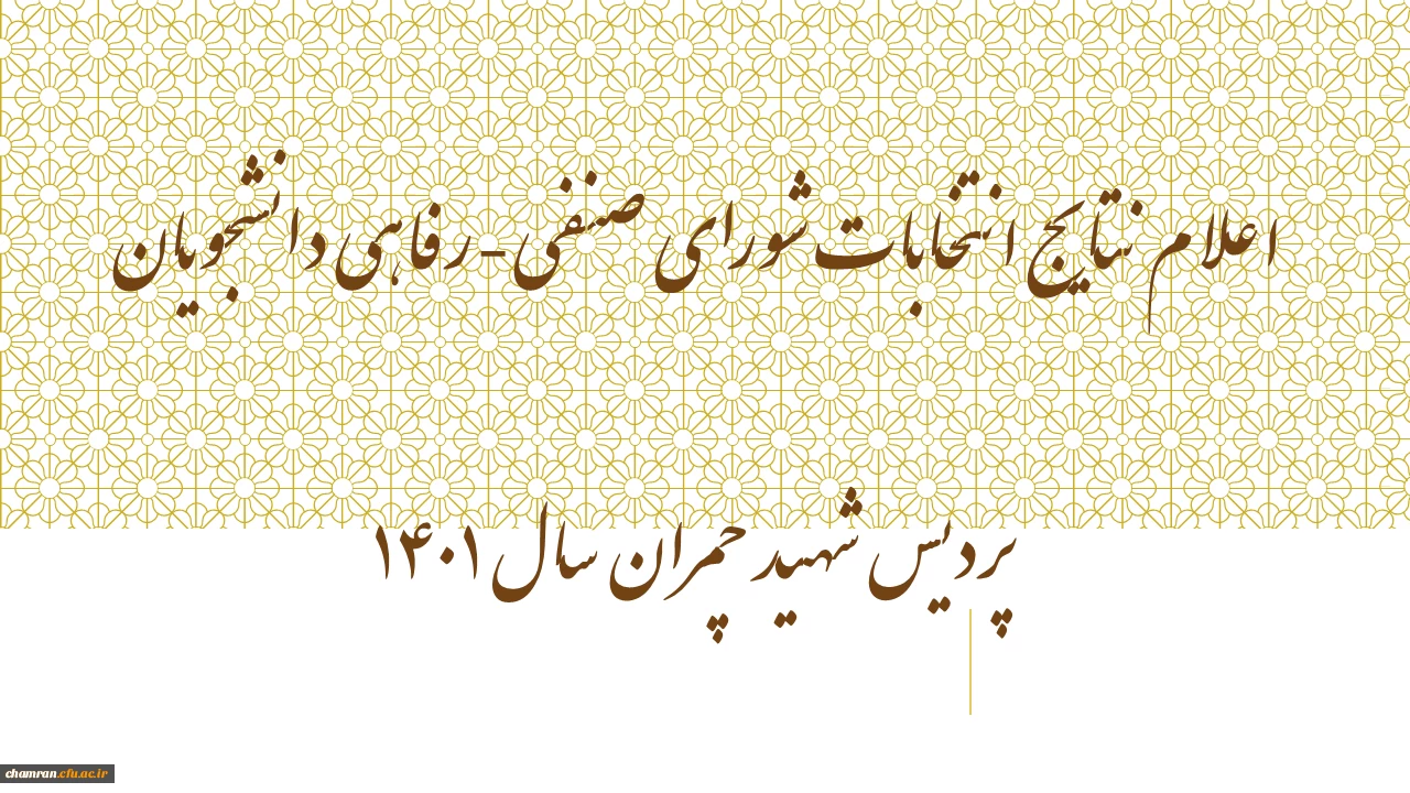 امتیاز دهید : اعلام نتایج انتخابات شورای صنفی-رفاهی دانشجویان پردیس شهید چمران سال ۱۴۰۱ 2 سهشنبه 17 خرداد 1401 ساعت 8:27