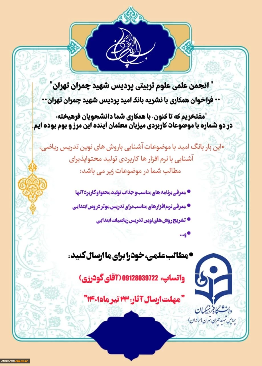 فراخوان همکاری با نشریه بانگ امید پردیس شهید چمران تهران 2