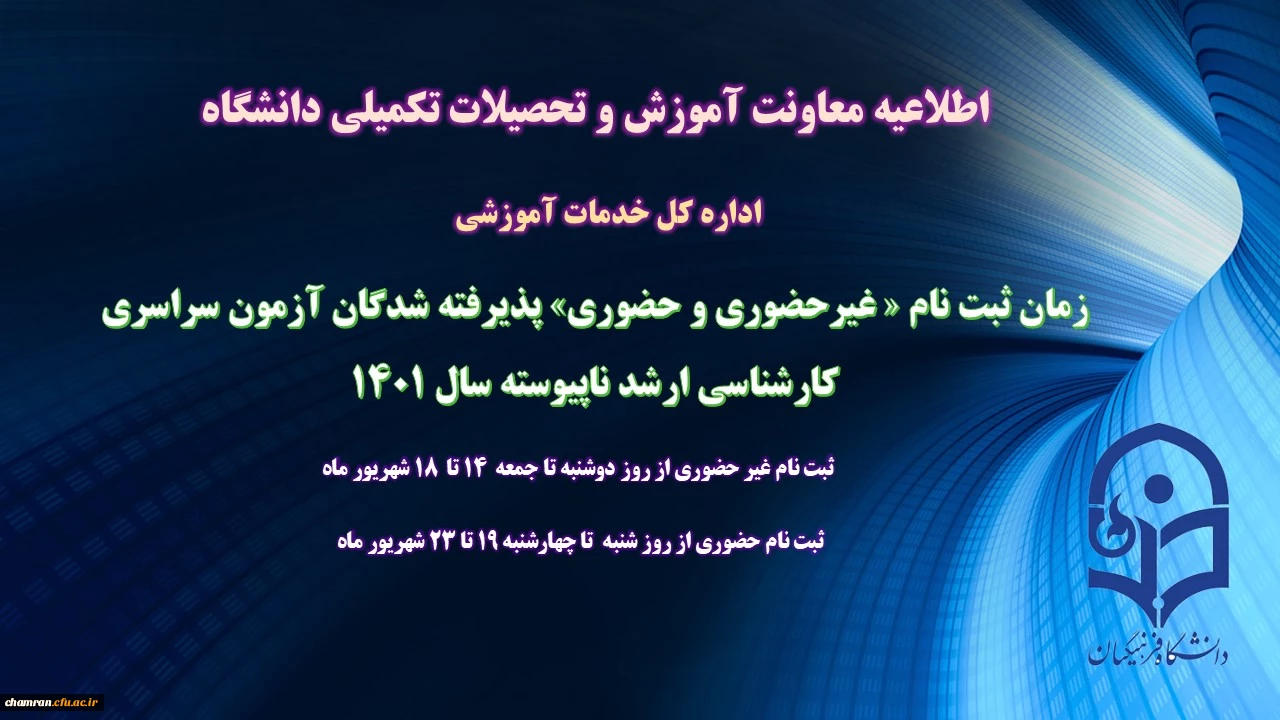 امتیاز دهید : زمان ثبت نام « غیرحضوری و حضوری» پذیرفته شدگان آزمون سراسری کارشناسی ارشد ناپیوسته ۱۴۰۱ 2 یکشنبه 13 شهریور 1401 ساعت 15:18