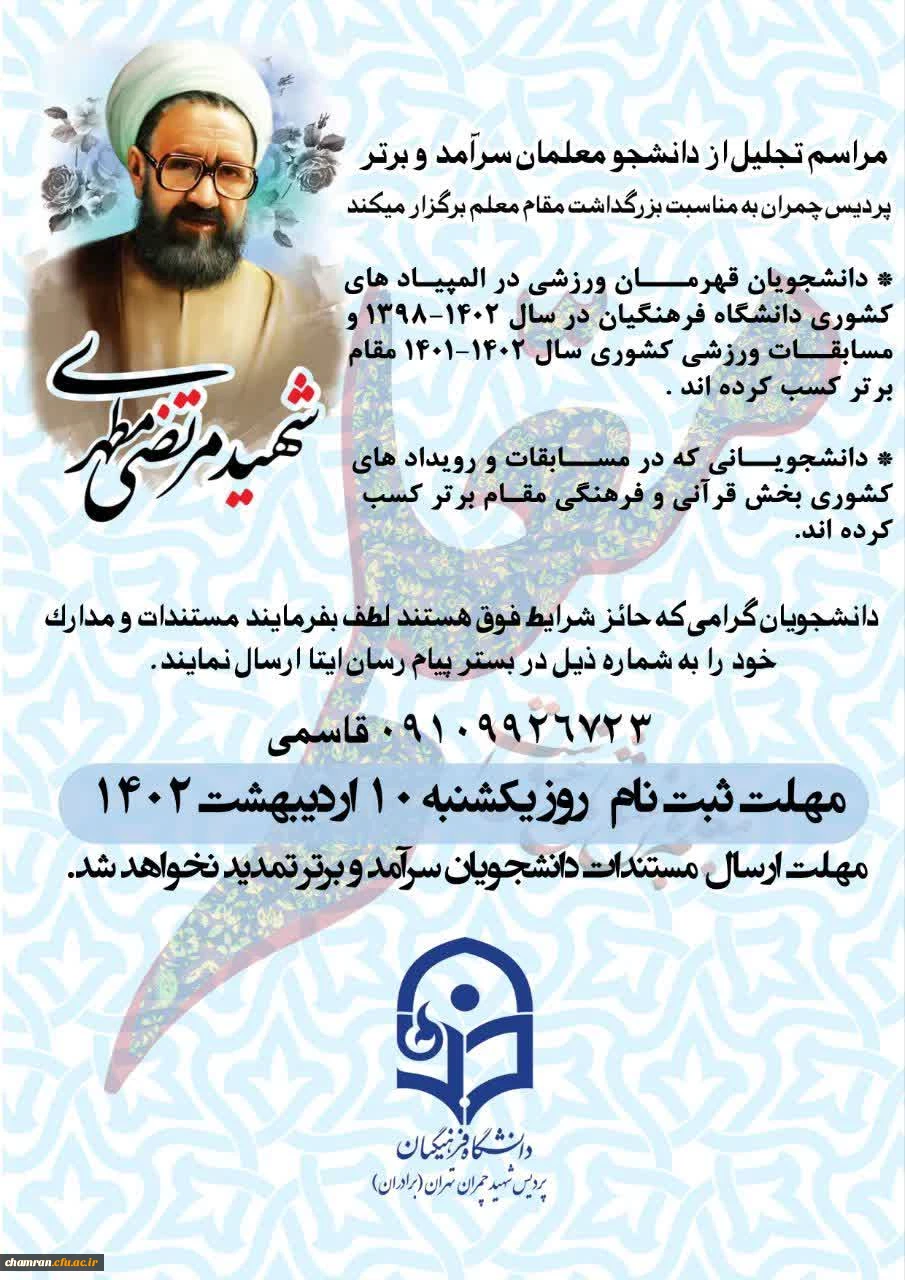 امتیاز دهید : تجلیل از دانشجو معلمان سرآمد و برتر پردیس شهید چمران به مناسبت بزرگداشت مقام معلم 2 جمعه 8 اردیبهشت 1402 ساعت 13:10