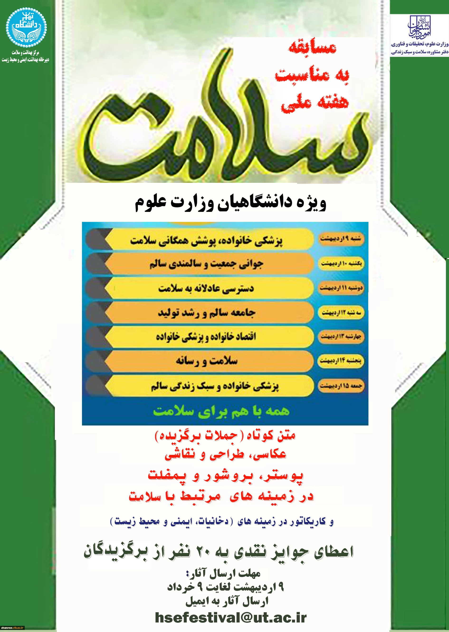 امتیاز دهید : برگزاری مسابقه فرهنگی، هنری با محوریت «سلامت دانشگاهیان» 2 یکشنبه 31 اردیبهشت 1402 ساعت 13:17