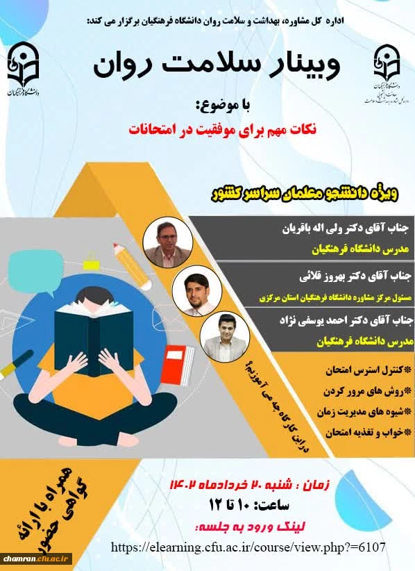 امتیاز دهید : برگزاری کارگاه آموزشی «نکات مهم برای موفقیت در امتحانات» ویژه دانشجومعلمان سراسر کشور 2 شنبه 20 خرداد 1402 ساعت 7:59