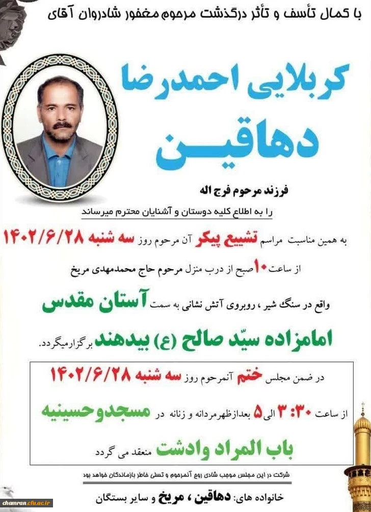 امتیاز دهید : تسلیت درگذشت همکار بازنشسته مرحوم آقای احمدرضا دهاقین 2 دوشنبه 27 شهریور 1402 ساعت 20:51