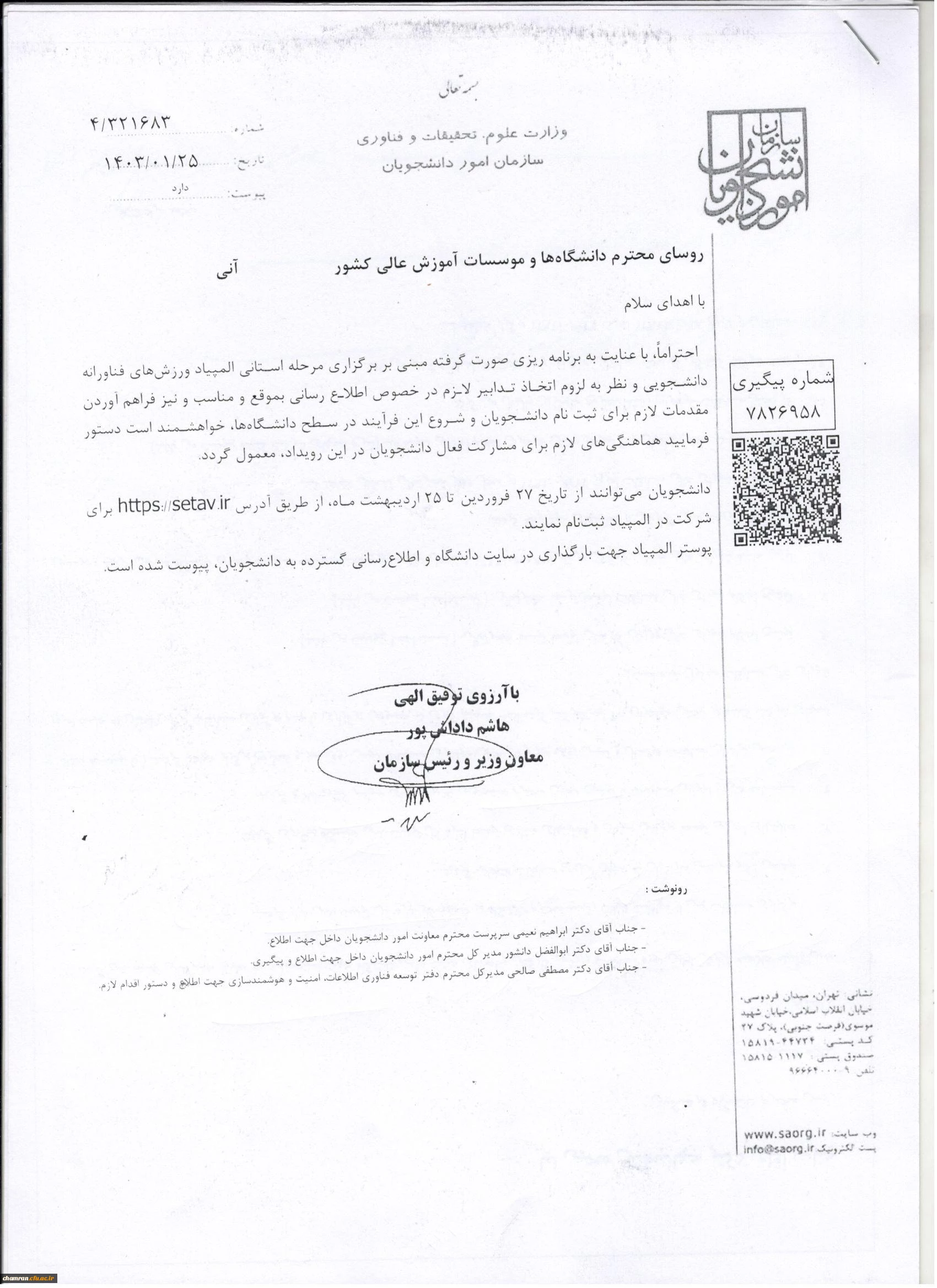 امتیاز دهید : ارسال بخشنامه مرحله استانی المپیاد ورزش های فناورانه وزارت علوم، تحقیقات و فناوری 2 سهشنبه 4 اردیبهشت 1403 ساعت 16:13