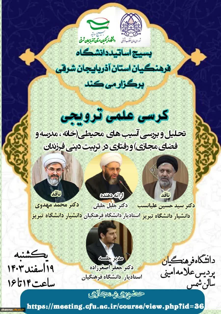 امتیاز دهید : کرسی علمی ترویجی (تحلیل و بررسی آسیب های محیطی و رفتاری در تربیت دینی فرزندان) 2 چهارشنبه 15 اسفند 1403 ساعت 10:57