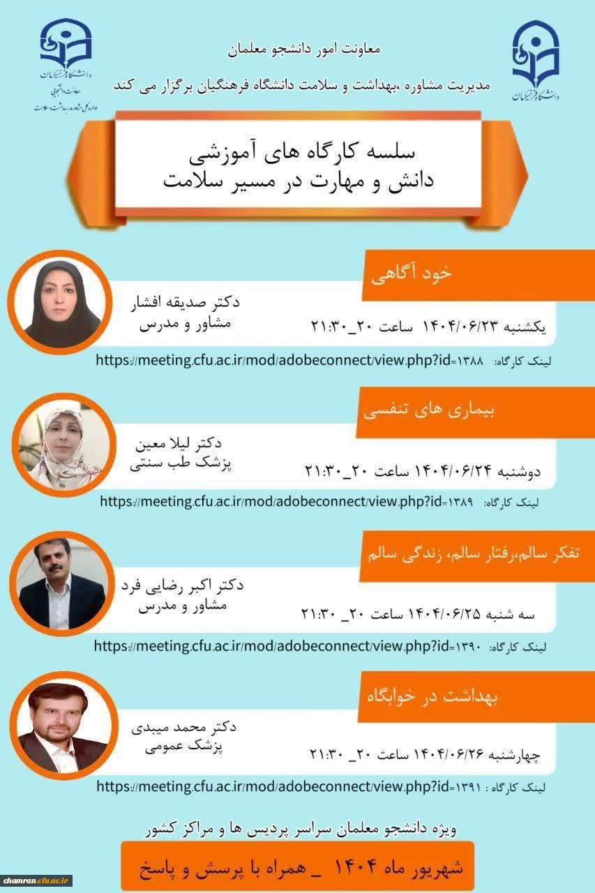 امتیاز دهید : سلسله کارگاه های آموزشی "دانش و مهارت در مسیر سلامت" 2 پنجشنبه 20 شهریور 1404 ساعت 20:59