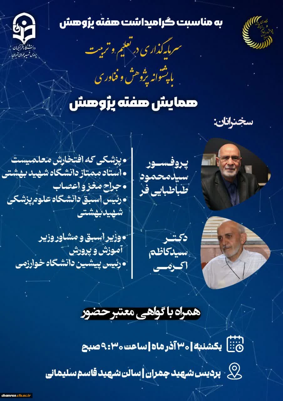 امتیاز دهید : اطلاعیه | همایش هفته پژوهش به مناسبت گرامیداشت هفته پژوهش 2 شنبه 29 آذر 1404 ساعت 10:19