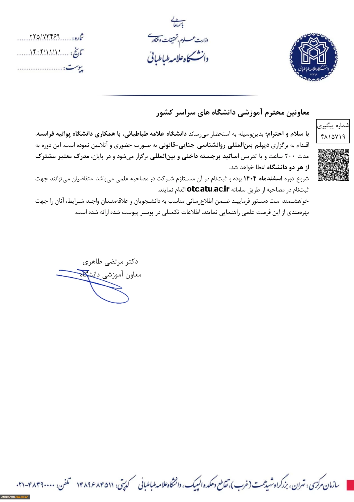 به پیوست پوستر و نامه شماره ۷۳۴۶۹/۲۲۵ مورخ ۱۱/۱۱/۱۴۰۴ دانشگاه علامه طباطبائی تهران در خصوص برگزاری دیپلم بین‌المللی روان‌شناسی جنایی-قانونی با همکاری دانشگاه پواتیه فرانسه به حضور ارسال می‌گردد.