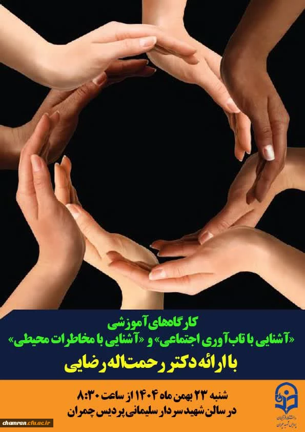 به اطلاع کلیه مهارتآموزان ماده ۲۸ میرسد، دو کارگاه آموزشی با عناوین «آشنایی با تابآوری اجتماعی» و «آشنایی با مخاطرات محیطی» در روز پنجشنبه ۲۳ بهمنماه ۱۴۰۴، از ساعت ۸:۳۰ لغایت ۱۲:۳۰، در سالن اجتماعات پردیس شهید چمران با ارائه دکتر رحمتالله رضایی برگزار خواهد شد. لذا کلیه مهارتآموزان محترم جهت دریافت گواهی ۶ ساعت ضمن خدمت ملزم به شرکت در این کارگاه میباشند. شایان ذکر است حضور تمامی مهارتآموزان ماده ۲۸ در این کارگاه الزامی است.